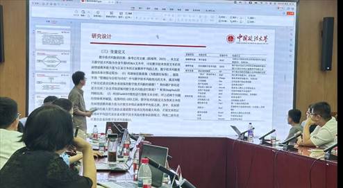 随后,在学术报告交流环节,多位博士生和硕士生进行学术论文交流分享。胡凯旋、郭梦竹、耿晋、邹瑶瑶等人依次进行分享,研究内容覆盖数字技术风险、大语言模型在经济预测中的应用、企业债务融资成本、上市公司低碳技术创新、“一带一路” 股市风险传染、企业社会责任承担、供应链共享审计与创新关系等前沿方向。每篇论文汇报后,与会师生围绕研究框架、方法设计、学术价值及改进方向等方面展开深入讨论,汇报人与参会者即时互动,围绕研究中的重点难点展开探讨,形成了良好的学术交流氛围。
