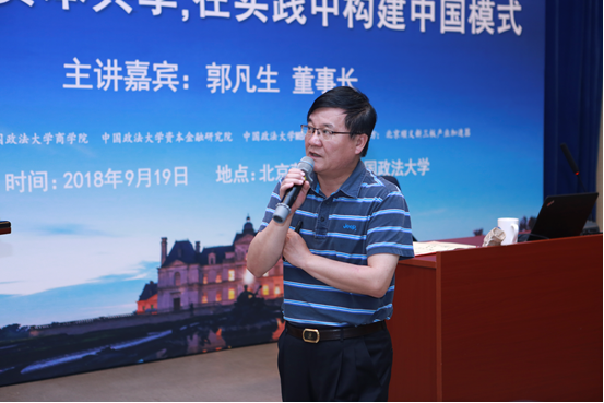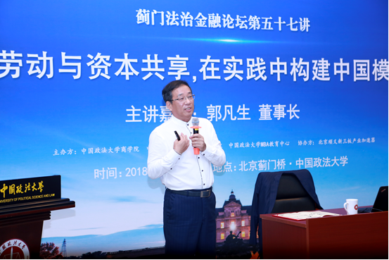 随后,香港上市公司慧聪集团创始人、慧聪书院董事长郭凡生董事长从商者有其股、财产权变更、商业模式与商业制度之争、慧聪共享制企业的实践等方面为法大学子贡献了一场精彩的演讲。