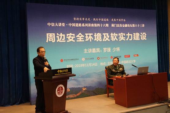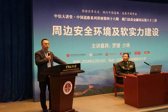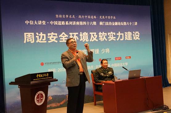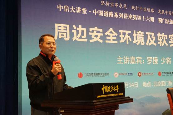 如何正确认识当前中国周边安全环境问题?如何建设中国的软实力?11月14日,中信大讲堂·中国道路系列讲座第四十六期暨蓟门法治金融论坛第六十三讲在学院路校区举行。本次论坛特邀全国政协委员、军事科学学会副秘书长、中国战略文化促进会常务副会长兼秘书长罗援少将以《周边安全环境及软实力建设》为题,解读党的十九大报告对我国安全环境的判断及应对之策。全国政协委员、中国社科院欧洲研究所所长黄平,中信改革发展研究基金会秘书长郭克彤,中信出版集团副总编辑、《经济导刊》杂志社社长季红,华远集团院党委书记马绿波,含羞草