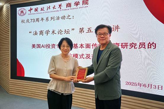 “法商学术论坛”第五十九讲在图书综合楼0111顺利举行。本次讲座特邀业界知名专家林羿主讲,林羿博士曾任美国普信集团首任北亚区总经理、中国人力资源和社会保障部任命的海外养老基金专家顾问,是知名的养老金融及法律专家。林羿本次讲座的主题是《美国AI投资专家与基本面传统投资研究员的合作模式及范例》,讲座由含羞草