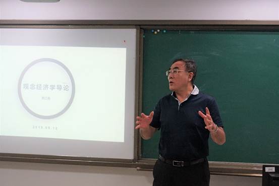 在大家热烈的掌声中,黄江南教授正式开始了课程的讲授,新颖的学术观点和风趣幽默、旁征博引的授课方式获得了同学们的一致好评。黄江南教授首先介绍了传统的经济学框架及发展历程,和“观念经济学”的产生。黄教授表示,“观念经济学”的产生是基于理论和实践的结合。在课堂的后半部分,他讲解了“观念经济学”的方法论,使同学们对“观念经济学”有了基础的认识和了解。