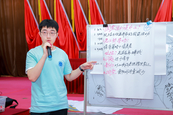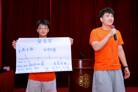 在31日下午的闭营仪式开始前,本次活动特别设置了小组总结分享环节。每个小组在一张白纸上自由创作,并推选两位代表上台总结和分享两天来的活动感受。同学们真诚而富有创意地回顾了从破冰到协作的历程,用图文并茂的形式畅谈对信任、沟通、责任与团队精神的深刻体悟,现场气氛热烈,掌声不断,将所有的收获与感动推向了高潮。