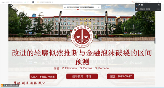 资本金融系2025年秋季学期第二期读书会成功举办。李泳老师以及2025级资本金融系的全体同学参与了本次读书会。本期读书会围绕李泳老师推荐的论文《修正轮廓似然推断与金融泡沫爆发的区间预测》(Modified profile likelihood inference and interval forecast of the burst of financial bubbles)展开深入研讨,2025级金融专硕李妍霏和罗润茜两位同学分别进行主题报告,并就论文中的方法与应用提出思考,李泳老师在最后进行了精彩点评。