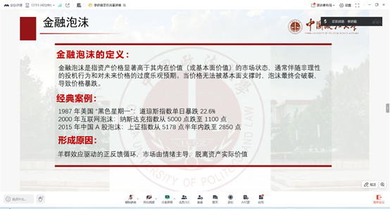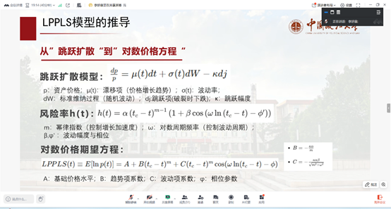 李妍霏同学首先介绍了金融泡沫的基本概念及其在经济周期中的重要性。她结合历史上几次著名的泡沫事件(如2000年互联网泡沫、2008年金融危机),阐述了泡沫形成机制及其崩溃对金融稳定的冲击。接着,她详细讲解了LPPLS模型的理论基础,该模型通过捕捉价格在泡沫期的超指数增长和log-periodic振荡,预警临界时间点的到来,为动态风险管理提供关键信号。
