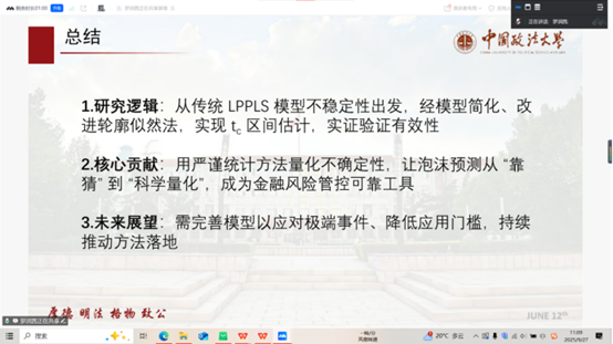 罗润茜同学随后聚焦于论文的方法论创新。她指出,传统LPPLS校准依赖普通最小二乘法,仅提供参数的点估计,存在较大不确定性。本文引入修正轮廓似然方法,通过有效处理“讨厌参数”的干扰,构建更为平滑的似然曲面,从而实现对临界时间的区间估计而非单点预测。罗润茜还结合论文中的合成数据与实证案例(如2015年中国股市泡沫),展示了该方法在多时间尺度分析中的稳健性与预警能力。